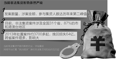 处置非法集资部际联席会议今天发布《关于办理非法集资刑事案件适用法律若干问题的意见》,同时指出当前非法集资形势依然严峻,发案数量、涉案金额、参与集资人数继续处于高位,达历年来第二峰值。非法集资案件涉及全国31个省(区、市)、87%的市(地、州、盟)和港、澳、台地区。据统计,2013年处置案件大概有3700多起,挽回损失64亿。新发案件更多地集中在中东部省份,跨省案件增多,影响较大,并不断向新的行业、领域蔓延。处置非法集资部际联席会议办公室主任刘张君提醒社会公众,非法集资不受法律保护,参与非法集资风险自担。