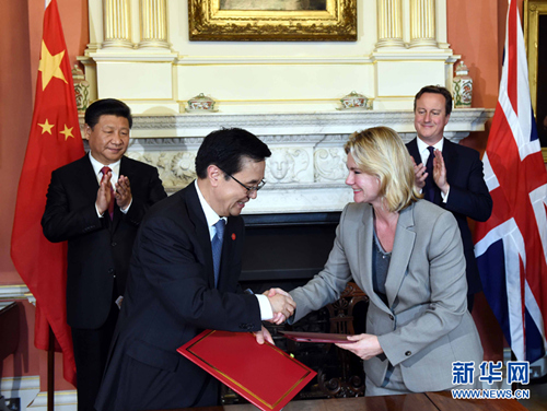 2015年10月21日,国家主席习近平在伦敦唐宁街首相府同英国首相卡梅伦举行会谈。这是会谈结束后,两国领导人共同见证双边合作文件的签署。新华社记者饶爱民摄