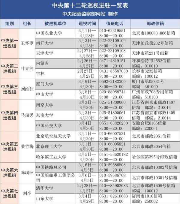中新网3月10日电 中央纪委监察部网站10日公布消息,十八届中央第十二轮巡视已全部进驻,并以表格形式汇总了各个巡视组的值班电话、邮箱等信息。