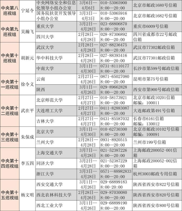 经中央批准,十八届中央第十二轮巡视将对北京大学、清华大学、北京师范大学、中国农业大学、北京航空航天大学、北京理工大学、南开大学、天津大学、大连理工大学、吉林大学、哈尔滨工业大学、上海交通大学、同济大学、南京大学、东南大学、浙江大学、中国科学技术大学、厦门大学、山东大学、武汉大学、华中科技大学、中南大学、中山大学、重庆大学、四川大学、西安交通大学、西北农林科技大学、西北工业大学、兰州大学等29所中管高校党委开展专项巡视。