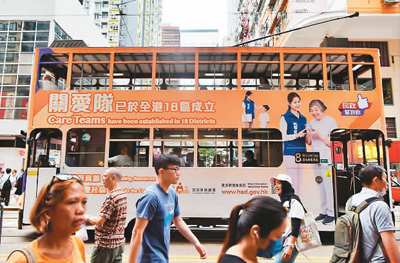 一辆涂装关爱队宣传海报的有轨电车从香港街头驶过。