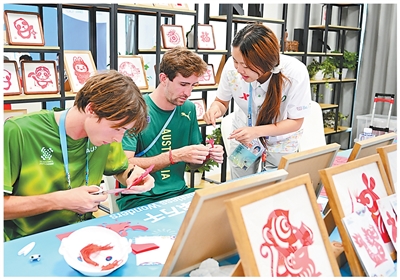 运动员在世运村非遗互动体验活动区学习剪纸。