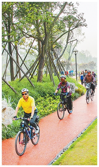 四川省成都市郫都区,市民在沱江河绿道骑行。