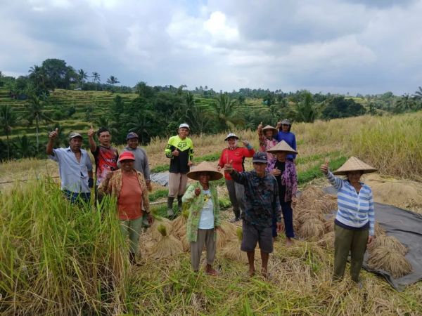 两个词与这张照片共同展现了中国云南省与印度尼西亚巴厘省合作开展有机水稻种植项目、惠及当地农户的情景。