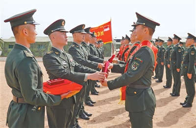 9月15日,“刘老庄连”举行“新时代刘老庄八十二勇士”颁授仪式,连队干部为新当选的勇士颁发证书。