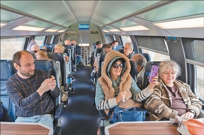 在匈塞铁路的高铁列车上,乘客正在拍摄。